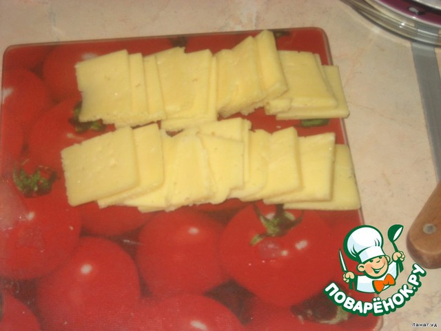 Сыр нарезать небольшими кусочками. Должно получиться столько кусков, сколько разрезов в свинине.