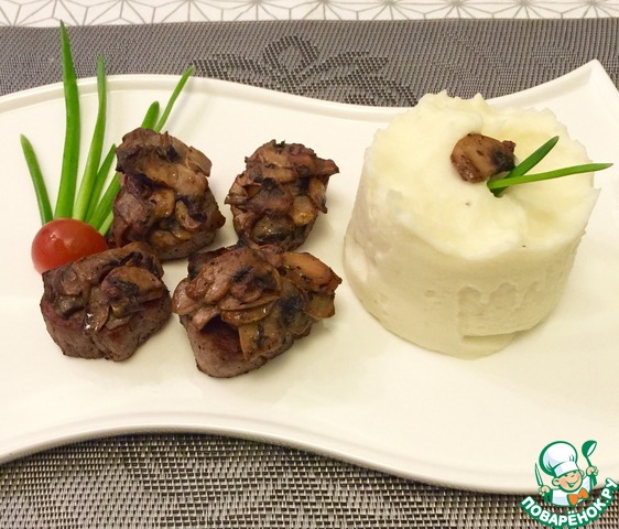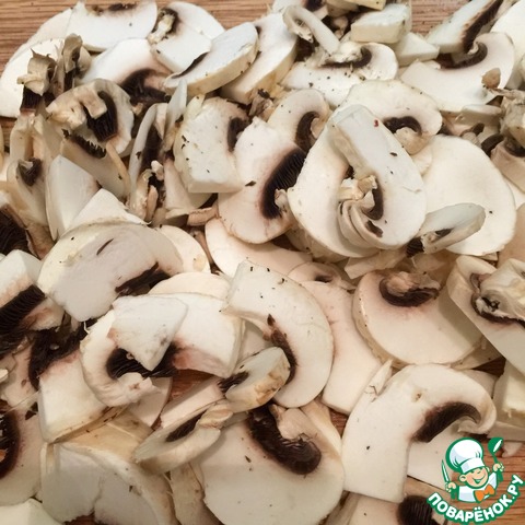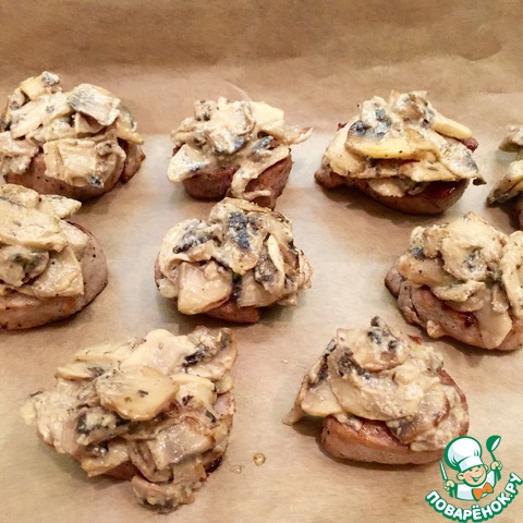 На пекарскую бумагу выкладываем мясо. Сверху кладем грибы. Ставим в разогретую до 190 градусов духовку на 15-20 минут. Приглядывайте! Духовки разные и капризные!