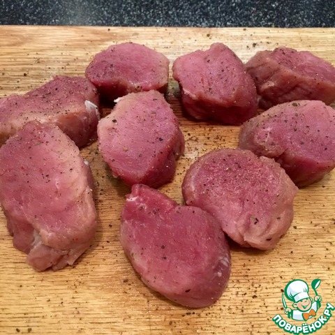 Нарезаем полендвицу на медальоны по 2 см толщиной. Солим-перчим.