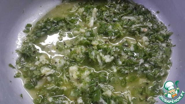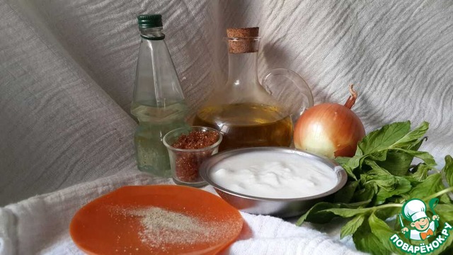 Лимонный сок, оливковое масло, перец, чеснок, мяту- смешать