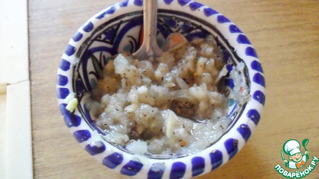 Чеснок и лук измельчить. Чеснок пропустить через давилку, а лук можно натереть на мелкой терке, измельчить в блендере или просто очень мелко порубить. Должна образоваться кашица, в которую добавляем соль и перец. Специи можно добавить и другие, на ваше усмотрение: красный перец, травы и т. д.