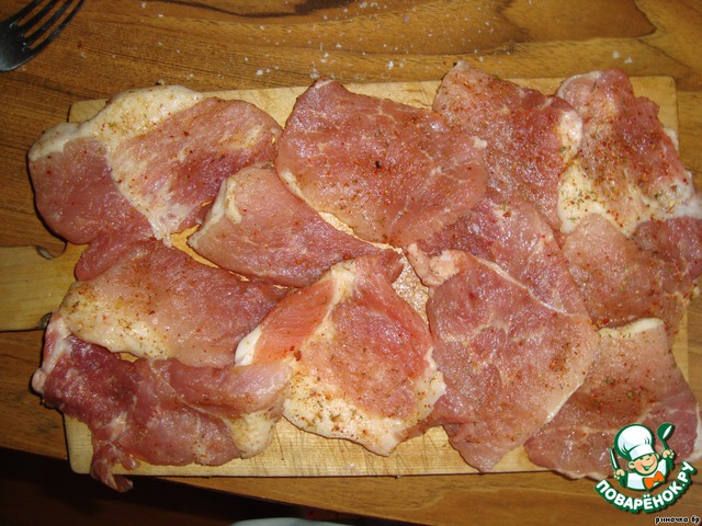 Режем свинину небольшими кусочками, слегка отбиваем, солим, перчим с двух сторон.