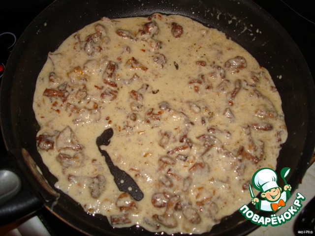 Готовое мясо выложить на тарелку и полить сливочно-грибным соусом.