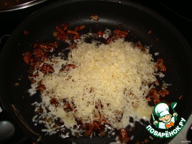 В сковороду выложить сыр и помешивать, пока сыр не расплавится.