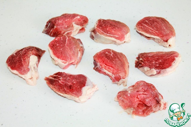 Свинину нарезаем не большими кусочками, толщиной примерно 1,5 см. К выбору мяса относитесь очень ответственно, так как половина успеха именно в хорошем мясе. У меня домашнее. Мясо не отбиваем.