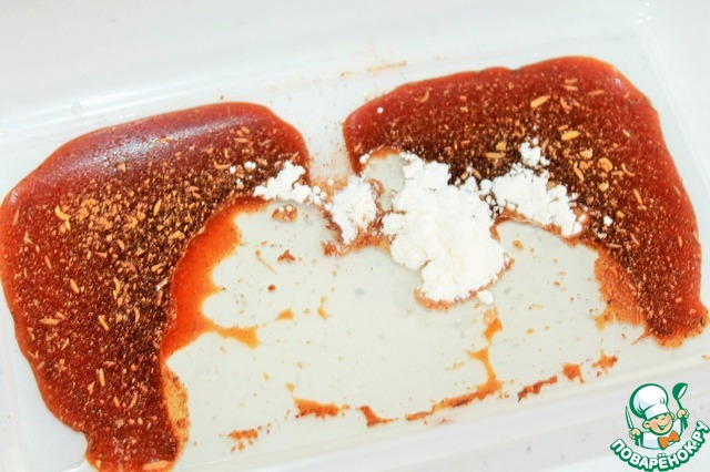 Растительное масло, паприку, перец и крахмал. Тщательно перемешиваем. Специи можете добавить любые по своему вкусу. Я мариную мясо в контейнерах это очень удобно.