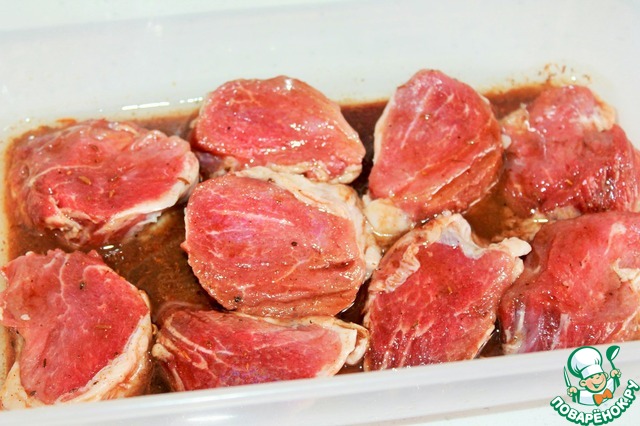 Мясо кладем в маринад, купаем его и оставляем мариноваться на 1 час. Время маринования зависит от толщины кусочков.