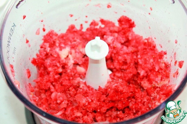 Клубнику измельчаем блендером. Я люблю соусы с мякотью, вы можете использовать сок клубники.