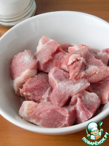 Мясо нарезать на кусочки среднего размера. Посолить.
