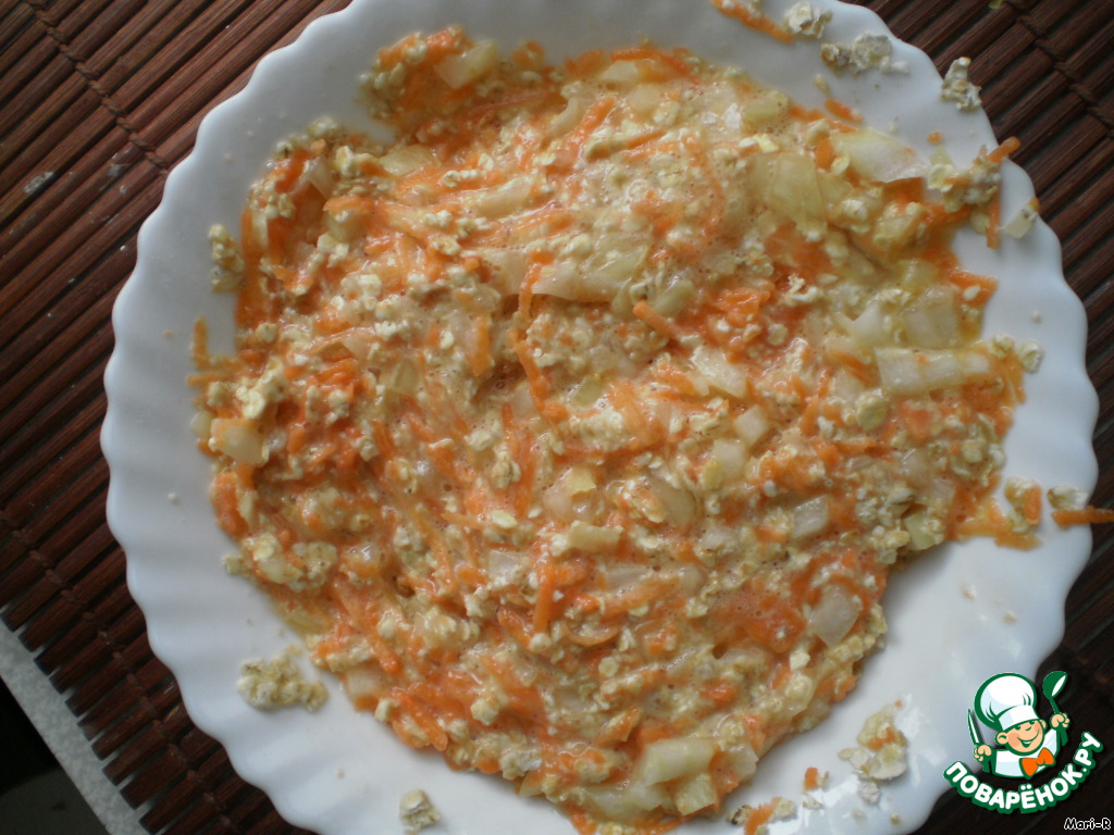 Приготовить овощную начинку, порезав мелко лук, натертую мелко морковь, овсянку и 3 яйца. Все перемещать до однородной массы. Посолить и поперчить.
