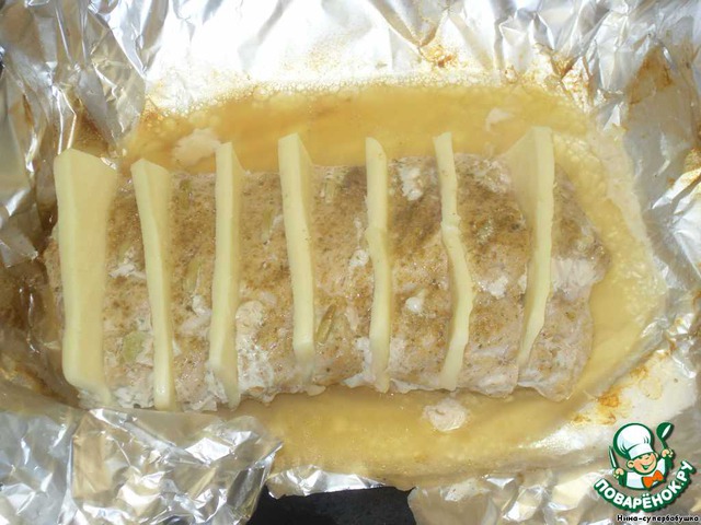 Сделать надрезы, не до конца, и вставить в них ломтики сыра.