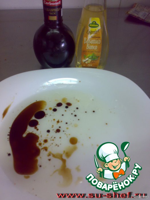 Возьмите два кусочка (по 100гр.) свинины, слегка отбейте. В неглубокой тарелке смешать - 1,5 ст.л. бальзамического уксуса Carbonell, 1,5 ст.л. бальзамического уксуса Balsamico Bianco, 5 гр. масло оливковое и соль по вкусу (смотрите фото). В получившемся маринаде мариновать свинину 10 минут в холодильнике (через 5 мин. переверните кусочки свинины на другую сторону). Замаринованную свинину слегка обваливаем в кукурузной муке (перемешанной с чёрным молотым перцем) и обжариваем по 2-3 минуты с каждой стороны на раскаленной сковороде. Довести до готовности в жарочном шкафу.