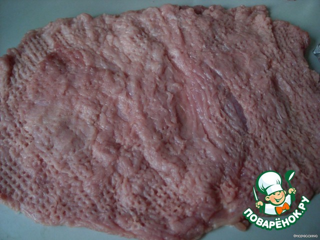 Сворачиваем в рулет, обвязывем ниткой и обжариваем, затем перекладываем в форму, заливаем водой и тушим в духовке до готовности, при подаче нарезать на куски.