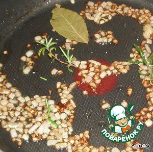 Добавить лавровый лист, розмарин и обжарить вместе с мясом на среднем огне.