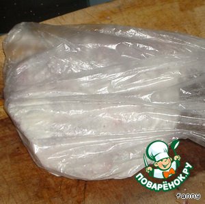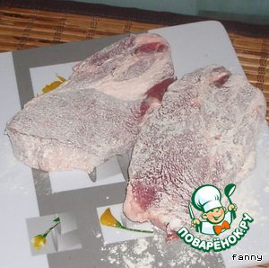Порционные куски свинины (я использовала свиную шейку, а в оригинальном рецепте свиные котлеты на косточке) обвалять в муке - для этого хорошо использовать целлофановый пакет, получается равномерно и удобно.