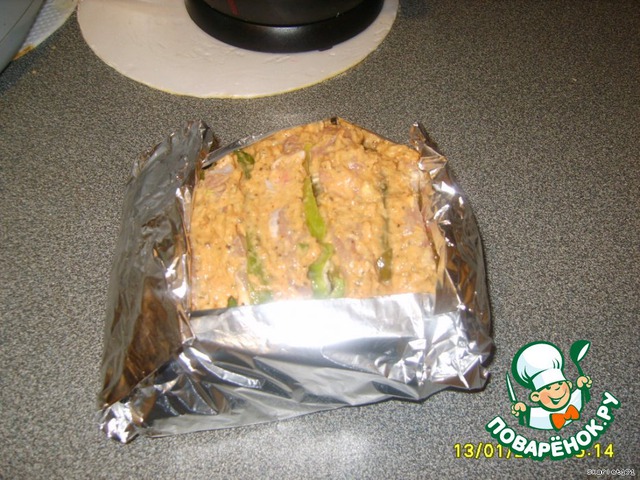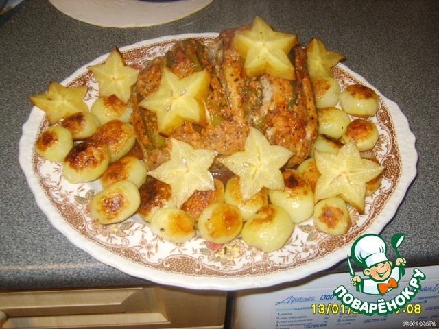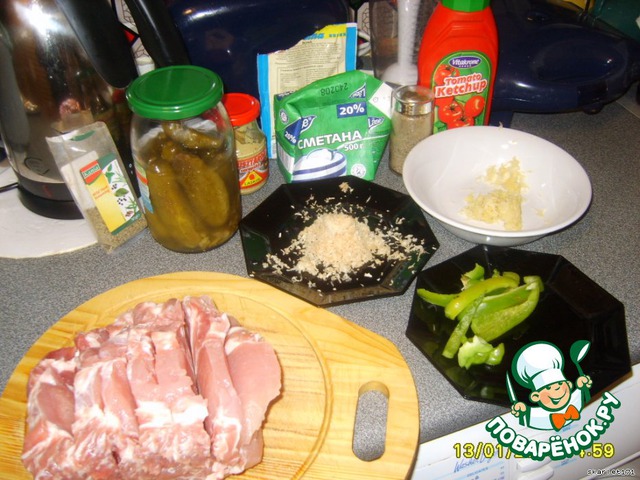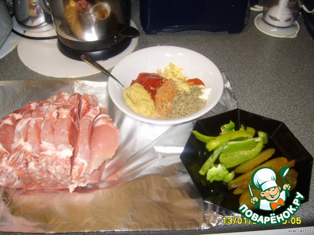 Смешать все специи, добавить сметану, мед, кетчуп, натереть этой смесью мясо и в разрезы вложить огурец и перец.