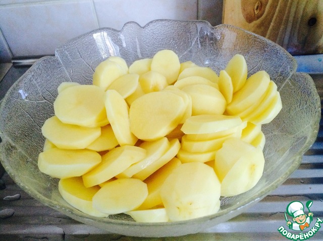 Сначала нужно вымыть и почистить картофель. Затем нарезать его колечками посолить и поперчить.