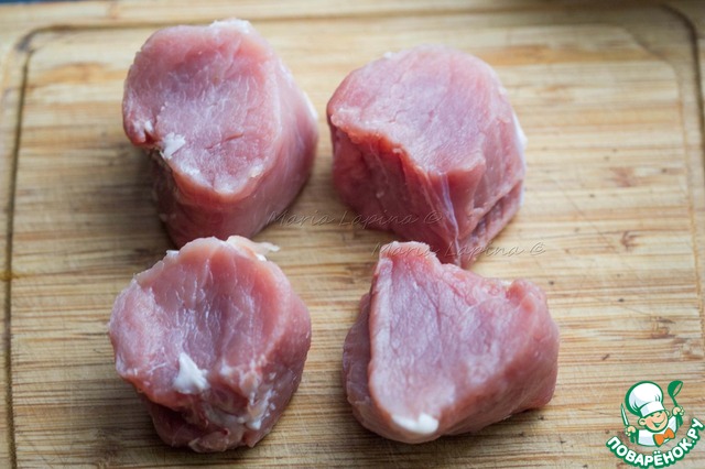 Первым делом опускаем рис в кипящую подсоленную воду, варим до готовности 30 минут. Из свиного филе нарезаем толстые шайбы. Придавливаем их ладонью и делаем в центре небольшой глубокий надрез.