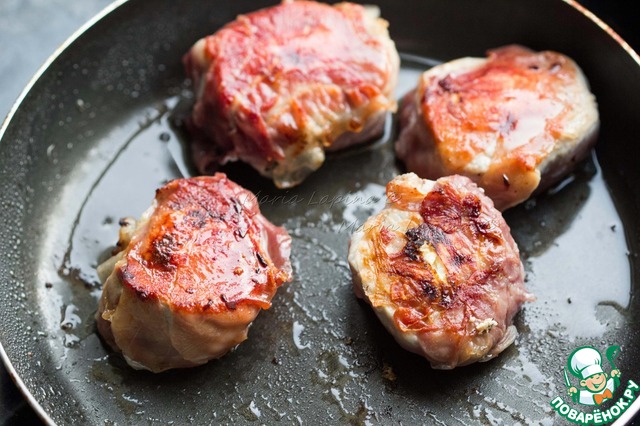 На сковороде разогреваем 2 ст. л. оливкового масла, кладем свиные медальоны хамоном вниз. Обжариваем 2-3 минуты до золотистой корочки. Переворачиваем свинину и жарим с другой стороны 3-4 минуты до румяности. Затем накрываем крышкой и томим на небольшом огне ещё 5 минут. В зависимости от толщины ваших медальонов время приготовление может быть сокращенно или увеличено.