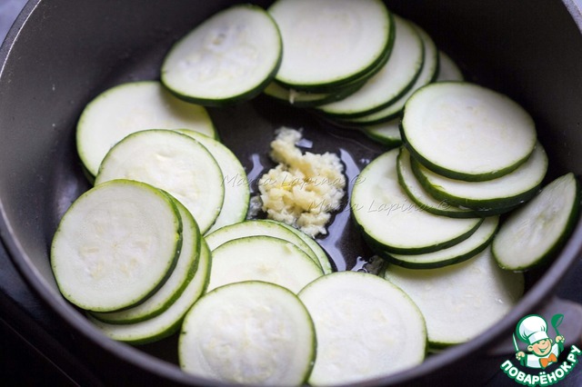 В сковороде разогреваем 2 ст. л. оливкового масла, кладем цуккини. В центр выдавливаем 2 зубчика чеснока, перемешиваем и обжариваем 4-5 минут.