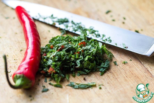 Мяту и перчик чили мелко порубим. Используйте перчик чили по вкусу.