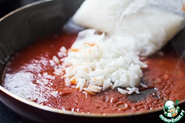 Кладем готовый рис в томатный соус, размешиваем и томим минуту.