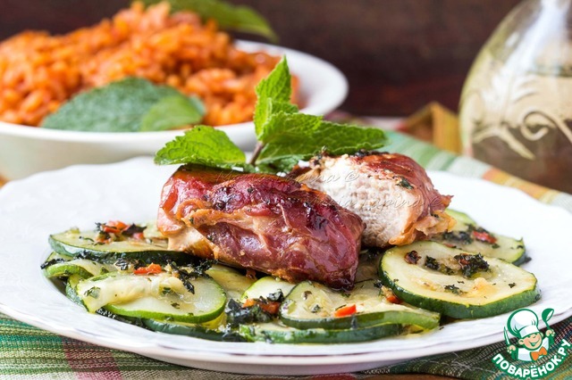 | Свинина, фаршированная фетой, в хамоне с цуккини и томатным рисом. Свежий, легкий и в то же время сытный рецепт быстрого ужина! С фетой и хамоном свинина получается очень вкусной и интересной. Томатный рис и мятный острый цуккини идеально дополняют картину. |