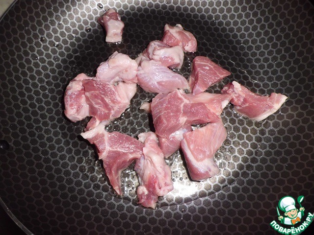 Мясо нарезаем маленькими кусочками и отправляем на сильно разогретую сковороду. Обжариваем минут пять.