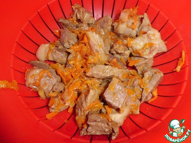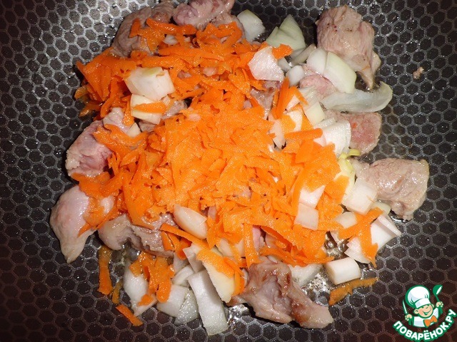 Убавляем огонь и добавляем к мясу морковь и лук. Жарим на среднем огне минут 15-20 (при необходимости добавляем несколько ложечек воды).