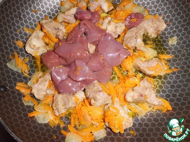 Печень режем мелкими кусочками и отправляем на сковороду, жарим минут 5.
