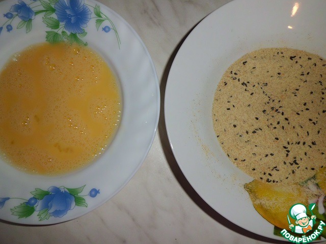 Берем одно яйцо, взбиваем его вилочкой. В другую тарелку насыпаем смесь. Это может быть: панировочные сухари, кунжут, панировочная смесь.