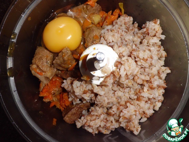 Оставшееся яйцо, гречку, мясо отправляем в комбайн и тщательно перемалываем. Нам нужна абсолютно однородная густая масса.