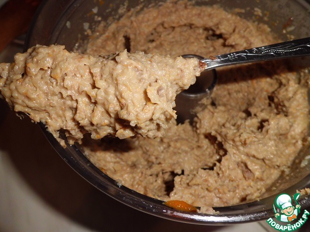 Получается достаточно густой "паштет". Если вдруг, по каким-то причинам масса более жидкая, стоит её дополнительно загустить гречкой.