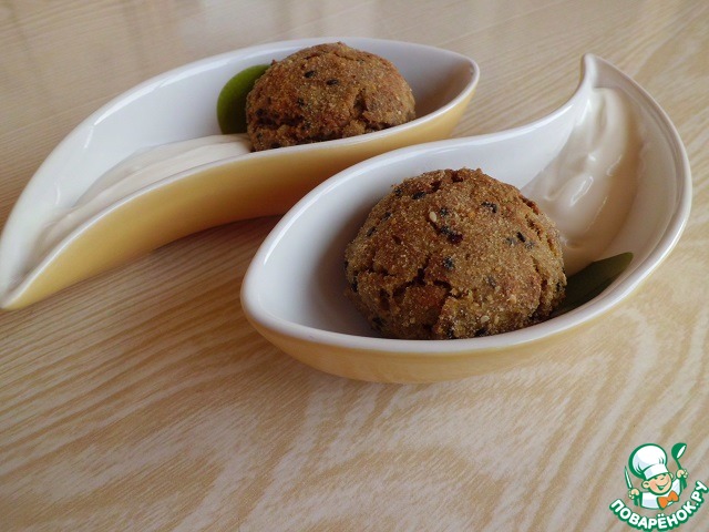 Они получаются очень нежные, поэтому достаточно сложно обвалять их в панировке. Я окунаю руки в яичную массу и уже после обволакиваю "шарик". Панировкой посыпаю, когда "шарик" находится на ладони. Повторяем эту операцию дважды. Выкладываем на противень. Поливаем каждый шарик оставшимся "соком".