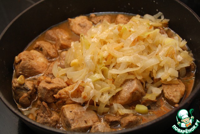 Добавьте к мясу обжаренный лук и потушите еще 15-30 минут.