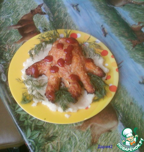 Украсить по желанию: кетчупом, укропом. Так рука выглядит еще ужаснее.