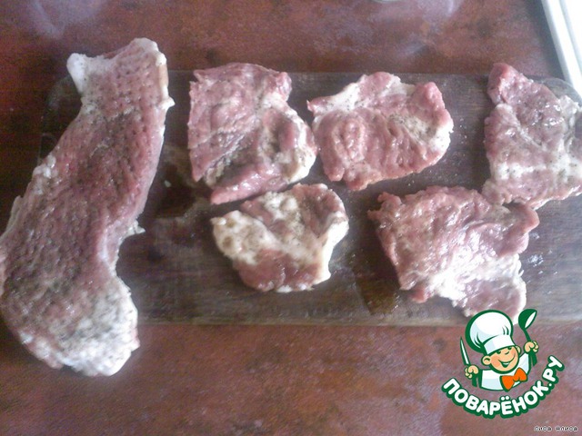 Тем временем нарезаю мясо кусочками толщиной в 1 см., слегка отбиваю с крупными зубцами, солю, перчу с одной стороны, капаю оливковым маслом и все это растираю.
