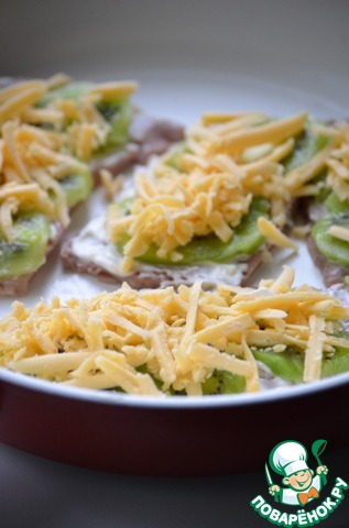 Сверху выложите очищенные и нарезанные кружочками киви.