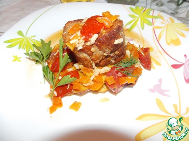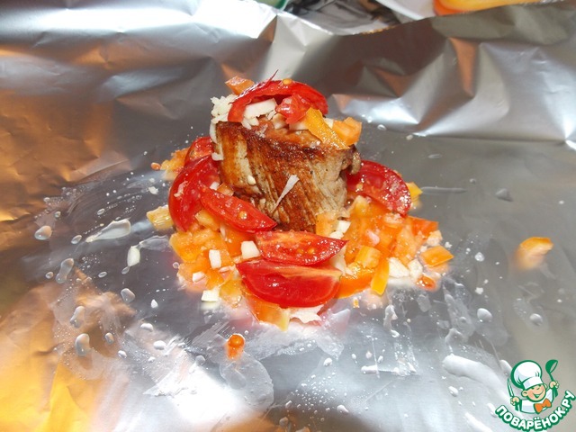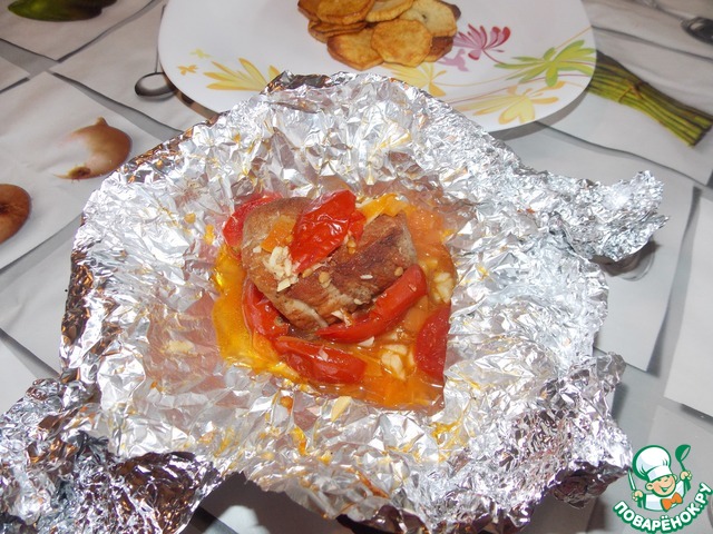 На фольгу кладем кусок мяса, и выкладываем овощи...