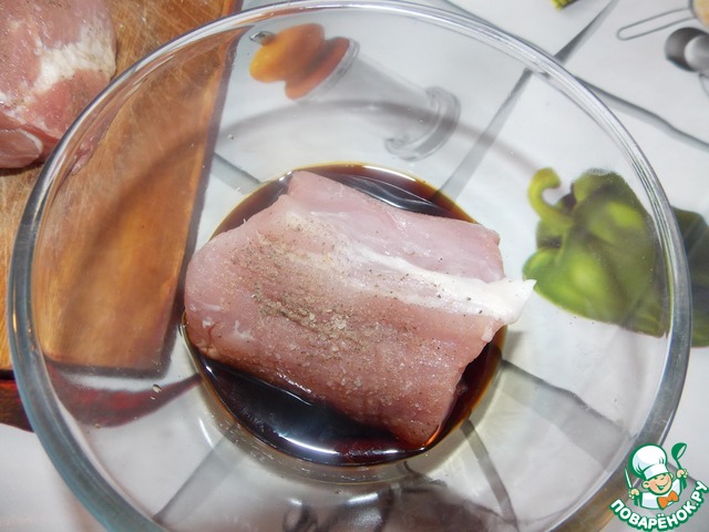 Затем каждый кусочек мясо полностью купаем в соевом соусе..