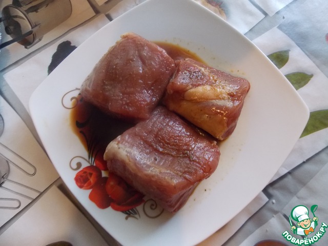 Затем выкладываем на тарелку куски мяса, поливаем оставшимся соусом и оставляем мариноваться минут на 10.