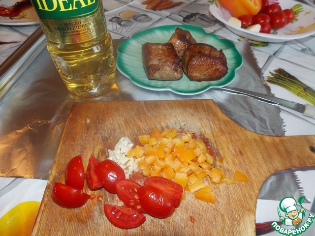 Затем нарезаем часть перца,1 зубчик чеснока, и 2 помидорки черри..
