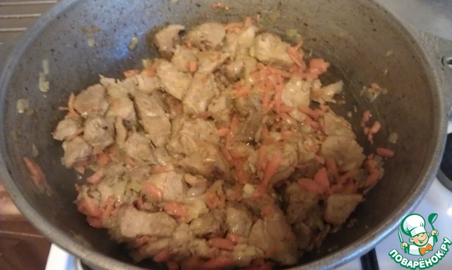 В почти готовое мясо добавляем морковь и лук, солим. Продолжаем тушить на маленьком огне приблизительно 15 мин.