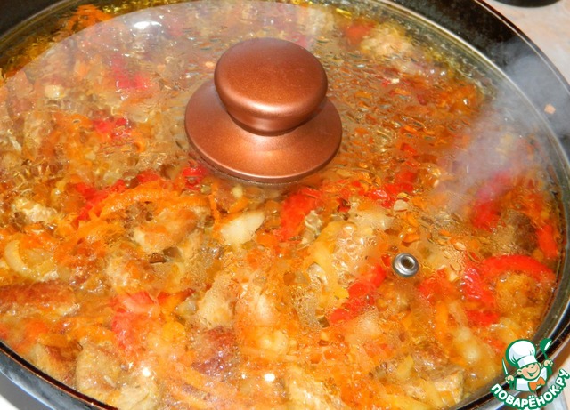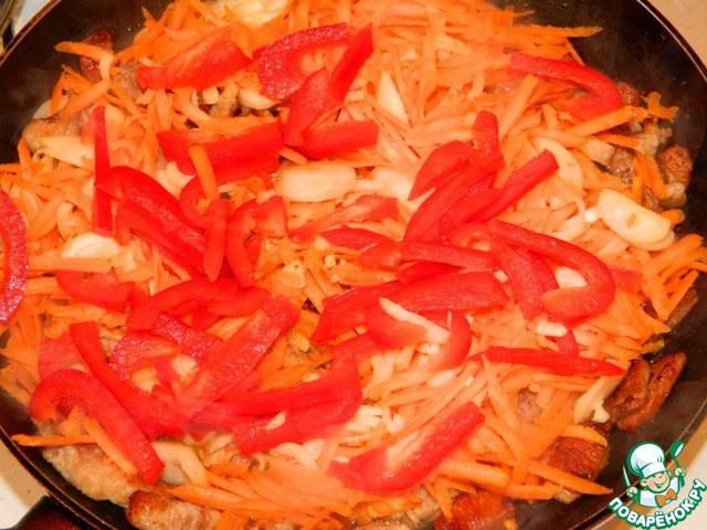 Мясо обжарить на сильном огне. Добавить к нему лук, морковь, перец. Обжарить все вместе.