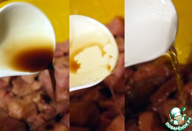 Выливаем к мясу: три столовых ложки соевого соуса, столовую ложку масла, чайную ложку уксуса. Перемешиваем и оставляем мариноваться (минимум на час).