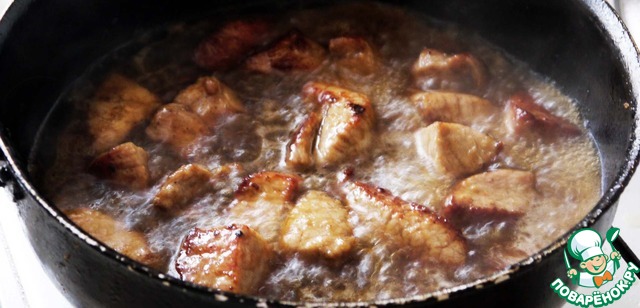 Мясо выкладываем на сковороду на разогретое масло (у меня на фото выложена половина - 2 порции). Каждый кусочек обжариваем с двух сторон, чтобы он взялся корочкой.