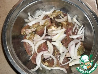 Лук нарезать полукольцами, добавить к мясу, перемешать. Мариновать в течении 1 часа.