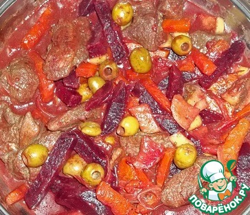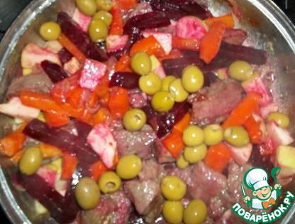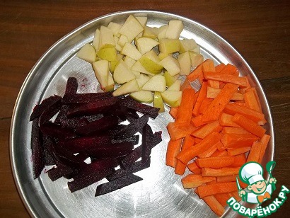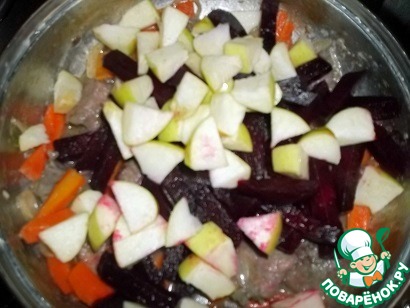 Пока мясо маринуется, можно отварить свеклу. Нарезать свеклу и морковь брусочками, а яблоко кубиками.