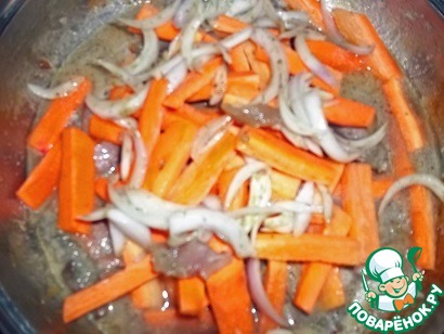 Выложить к мясу морковь и лук. Закрыть крышкой и тушить почти до готовности моркови.