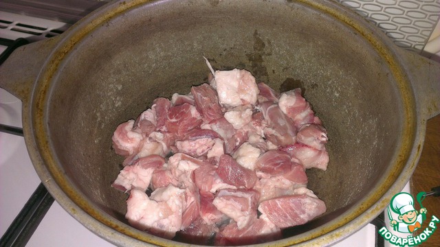 1) Все ингредиенты нарезаем кубиками. Разогреваем масло в кастрюле с толстым дном. И выкладываем нарезанное кубиками мясо. Я брала свинину, но можете брать мясо, которое вам нравится.